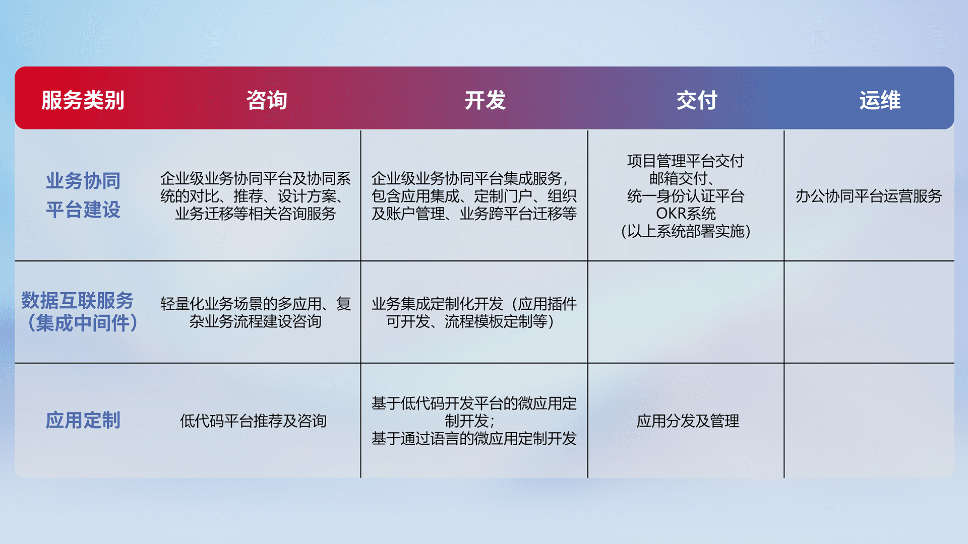 针对钉钉、、、、企微、、、IDaas等平台级产品提供产品的规划、、、方案、、、、交付、、、、定制化开发等服务,,实现如统一协同办公、、智能客户服务、、、、混合会议管理、、智能数据查询、、等业务场景,,,实现数字化转型。。。